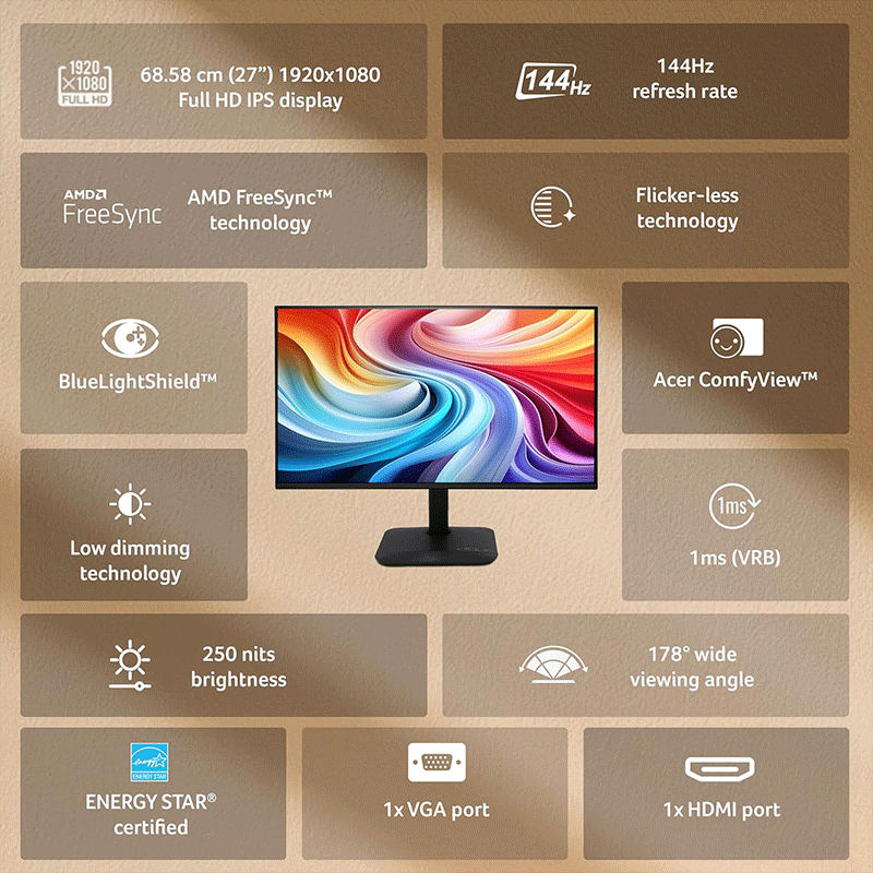 Acer KA270 P6 27 Inch IPS Full HD Backlit LED Monitor I 144Hz Refresh Rate, 1MS VRB, AMD FreeSync I 99% sRGB I 1 x VGA 1 x HDMI with Inbox HDMI Cable I Zero Frame Design I Eye Care I Stereo Speakers