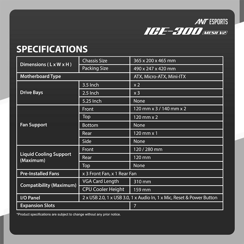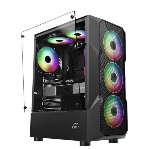 Ant Esports ICE-300 Mesh V2 is a high-airflow mid-tower gaming cabinet featuring a mesh front panel, 4 pre-installed 120mm ARGB fans, tempered glass side panel, and support for ATX, Micro-ATX, and Mini-ITX motherboards — combining performance, style, and optimal cooling in a compact design.
