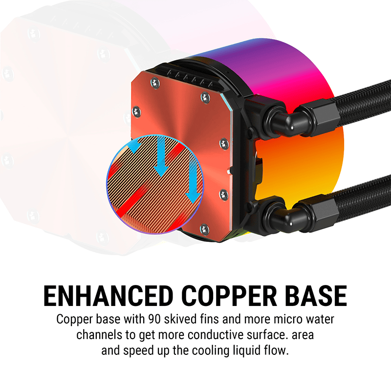 - High-performance cooling: The cooler utilizes a 360mm aluminum radiator with a dense fin stack and a custom copper base to maximize heat dissipation. The redesigned dual-chamber pump ensures higher coolant flow and quieter operation.