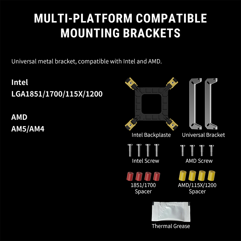 Supports Intel LGA1851/1700/1200/115X and AMD AM4/AM5 sockets.