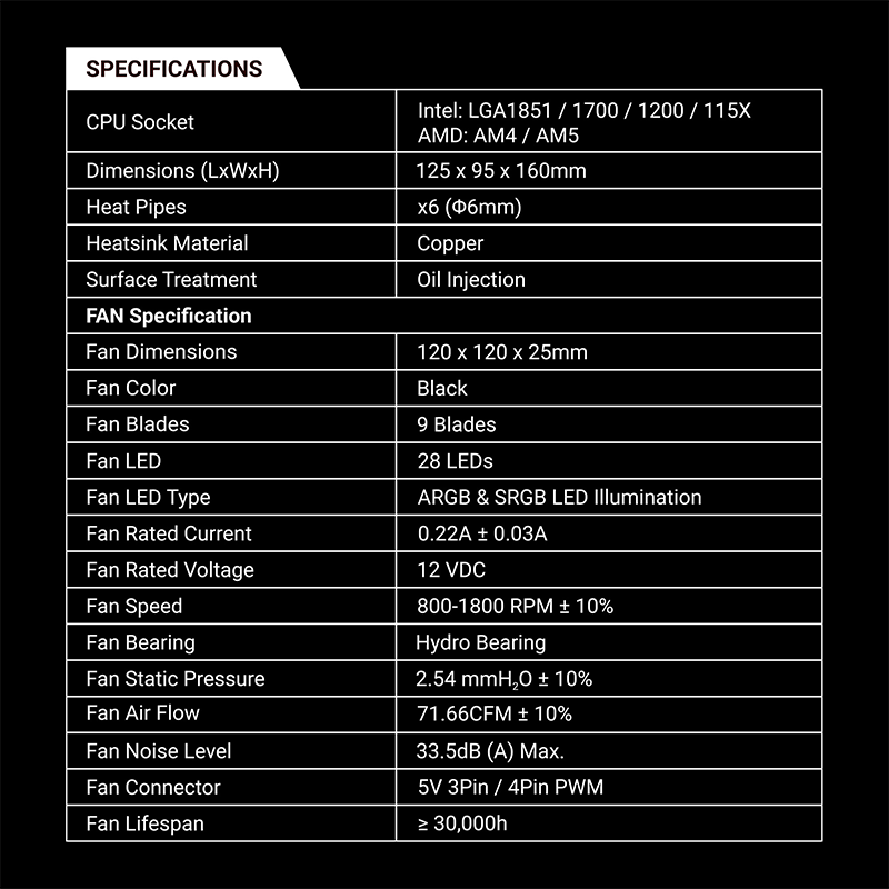 Constructed with a high-density aluminum heatsink, durable fan motor, and high-quality ARGB components, the V6 Digital is built to deliver long-term reliability. The cooler provides stable performance over extended gaming sessions while maintaining low acoustics and impressive visual appeal.