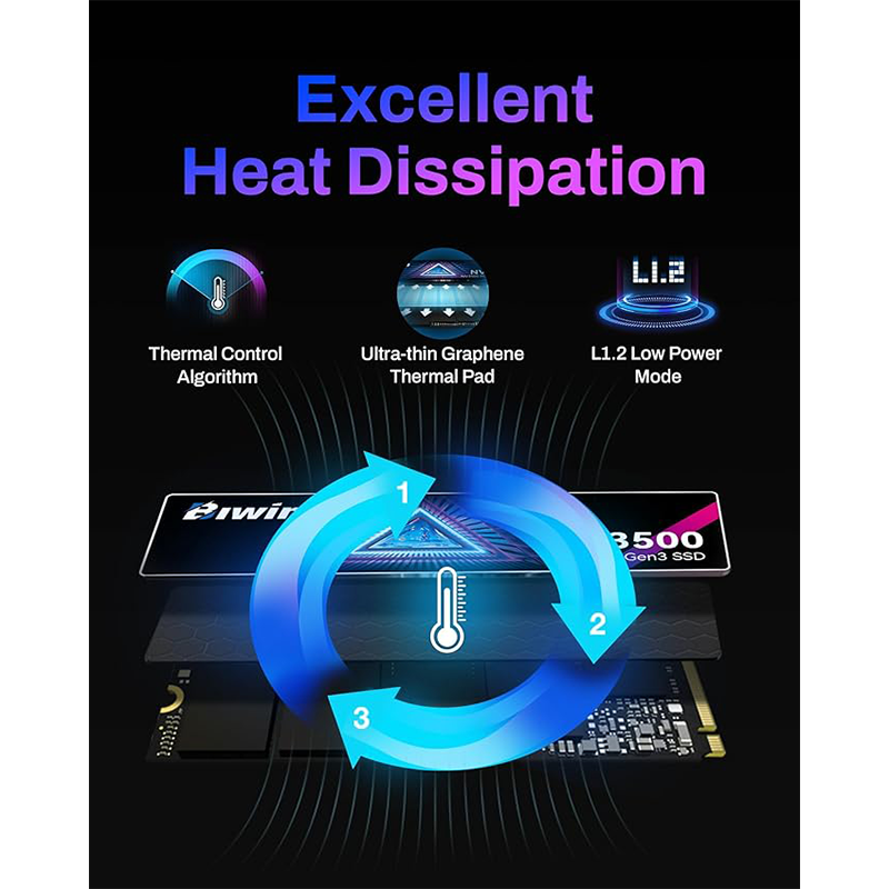 Biwin NV3500 M.2 SSD offers a read speed up to 3500 MB/s and write speed up to 3000 MB/s, utilizing the PCIe Gen 3×4 interface and the NVMe 1.4 protocol. NV3500 is equipped with a graphene thermal pad and supports a temperature control algorithm to maintain the SSD in optimal condition. It supports the L1.2 low-power mode, with a standby power consumption of less than 4 mW, significantly saving energy and extending standby time.