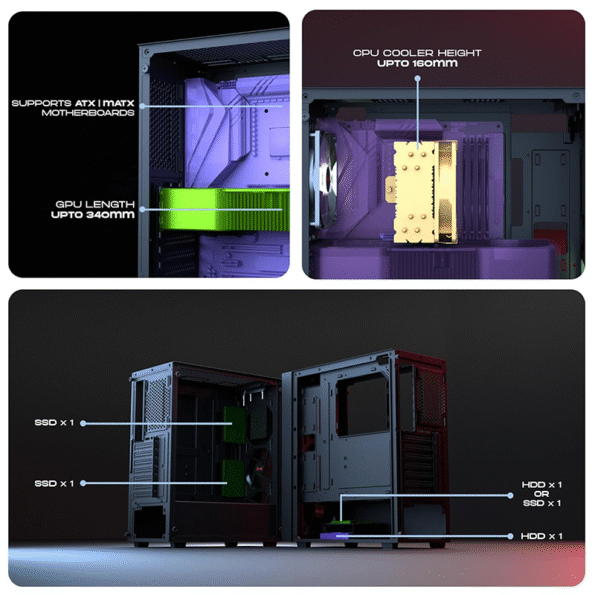 - Device Support: Built for performance, this chassis supports up to 340mm GPUs and 160mm CPU coolers with ease!