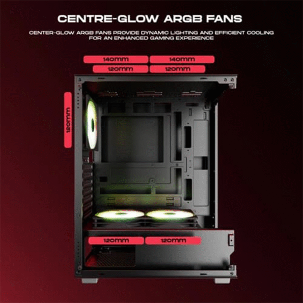 - Bountiful ventilation: Comes with 3 x 120mm center-glow ARGB fans—one at the rear and two at the bottom—with additional slots for dynamic lighting and efficient cooling.