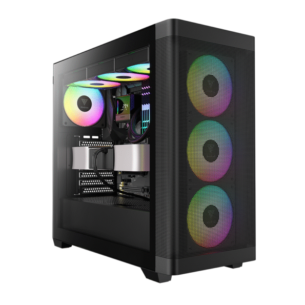 - Dynamic RGB Illumination: Three 120mm RGB fans deliver vibrant lighting effects, enhancing your gaming setup’s visual appeal.