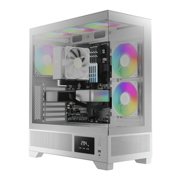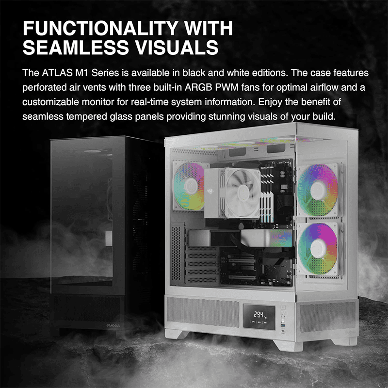 The ATLAS M1 Series is available in black and white editions. The case features perforated air vents with three built-in ARGB PWM fans for optimal airflow and a customizable monitor for real-time system information. Enjoy the benefit of seamless tempered glass panels providing stunning visuals of your build.
