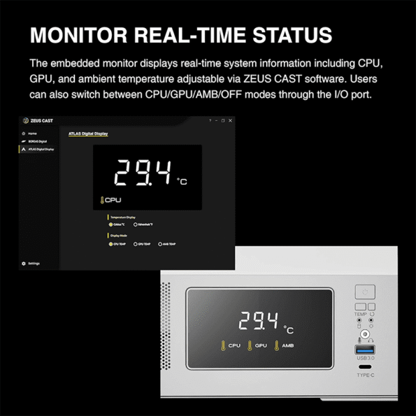 The embedded monitor displays real-time system information including CPU, GPU, and ambient temperature adjustable via ZEUS CAST software. Users can also switch between CPU/GPU/AMB/OFF modes through the I/O port.