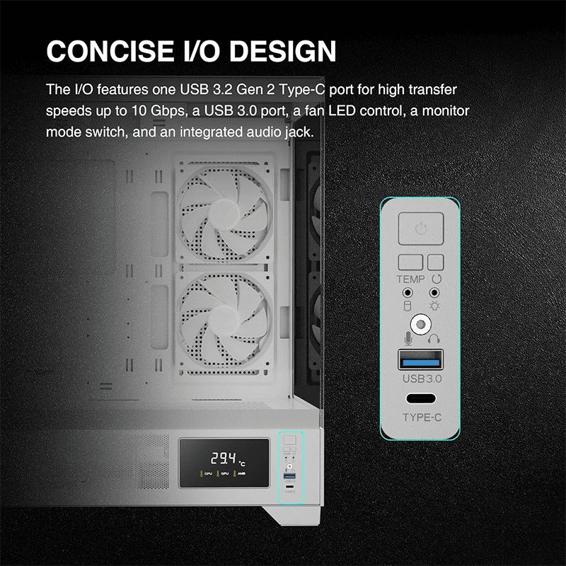 The I/O features one USB 3.2 Gen 2 Type-C port for high transfer speeds up to 10 Gbps, a USB 3.0 port, a fan LED control, a monitor mode switch, and an integrated audio jack.