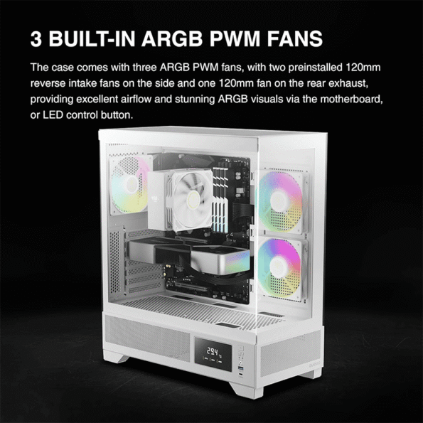 The case comes with three ARGB PWM fans, with two preinstalled 120mm reverse intake fans on the side and one 120mm fan on the rear exhaust, providing excellent airflow and stunning ARGB visuals via the motherboard or LED control button.