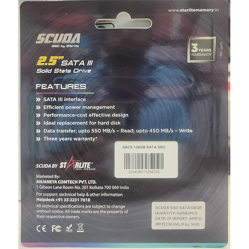 Built with durable flash memory and no moving parts, the SCUDA SSD provides improved shock resistance, lower power consumption, and quieter operation. It is compatible with desktops and laptops that support 2.5-inch SATA drives, making it a practical upgrade for enhancing system speed and efficiency.