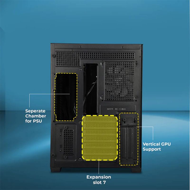 Spacious Interior — Supports full-size graphics cards, multiple storage drives, and large coolers.