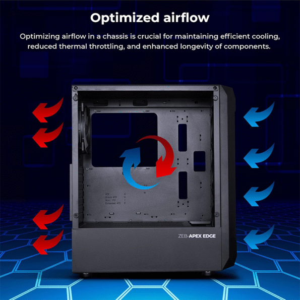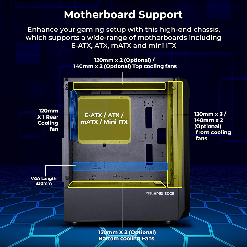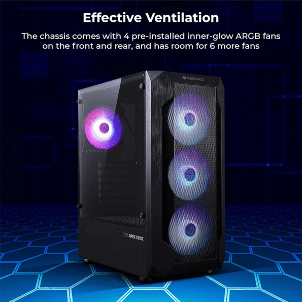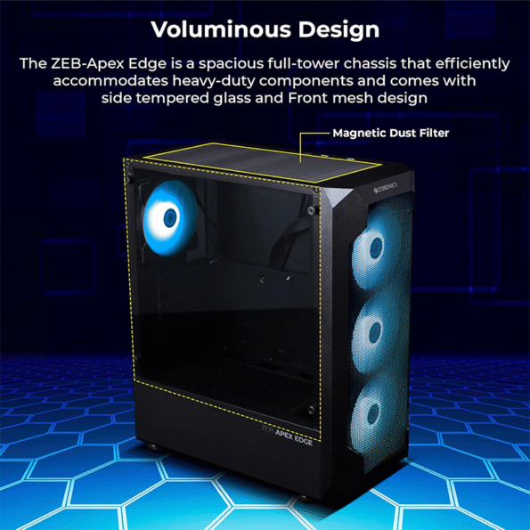 - Voluminous Design: The ZEB-Apex Edge is a spacious full-tower chassis that efficiently accommodates heavy-duty components and comes with side tempered glass and a front mesh design