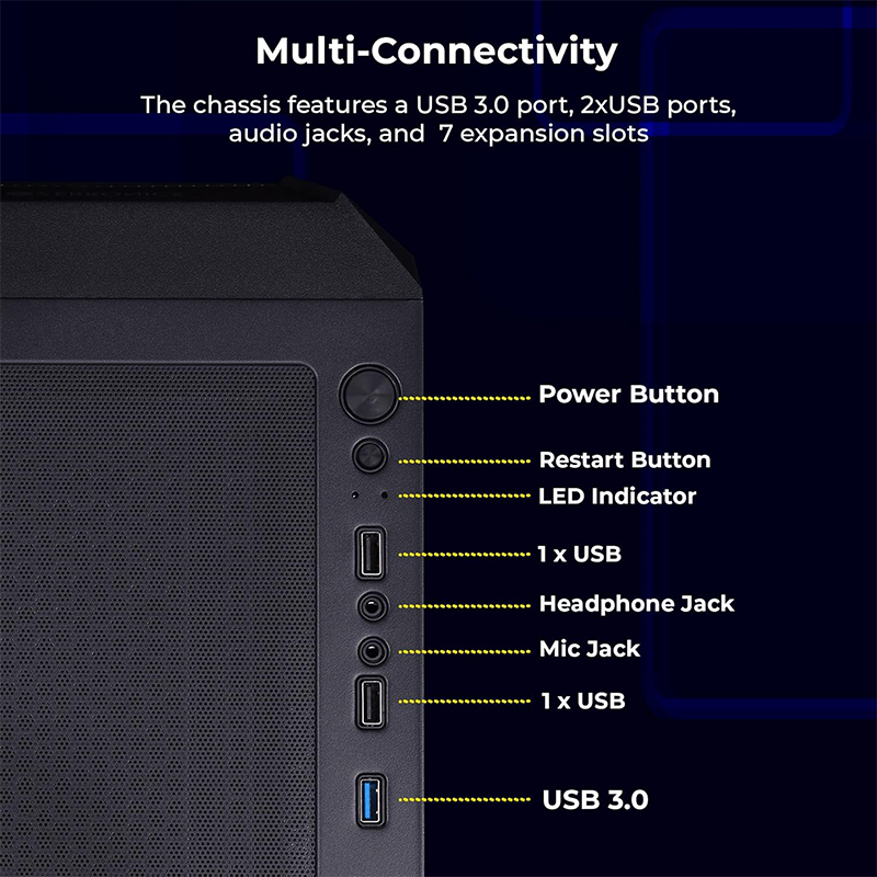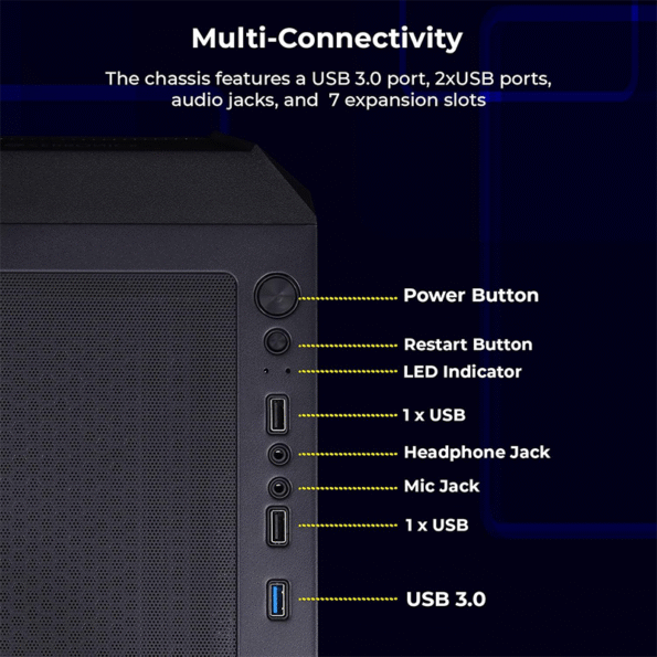 - Multi-Connectivity: The chassis features a USB 3.0 port, 2xUSB ports, audio jacks, and space to accommodate 7 expansion slots