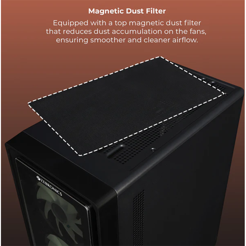 A magnetic dust filter is placed on the top panel to reduce dust accumulation, helping to maintain cleaner airflow paths. -