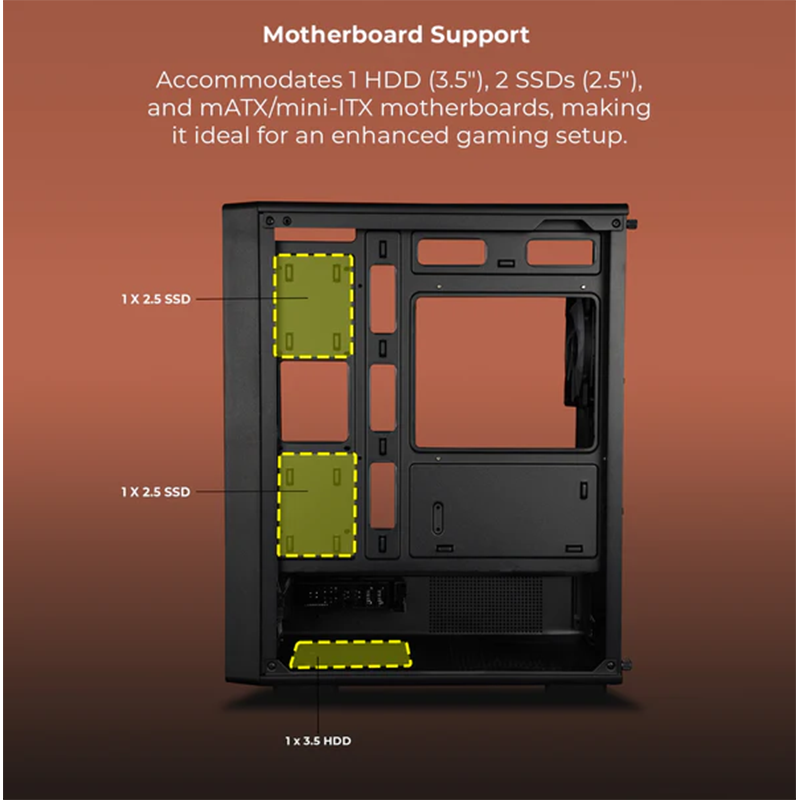 offering unbeatable performance, style and functionality. Compact yet powerful, this Micro-ATX cabinet features vibrant multi-colour fans for optimal cooling and aesthetics. Enjoy increased productivity and rely on a dependable companion throughout your journey to peak performance.
